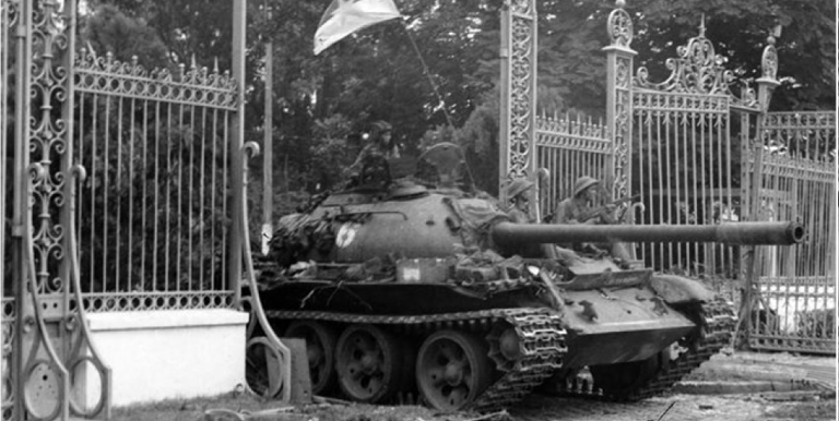 Xe tăng của Lữ đoàn tăng – thiết giáp 203, Sư đoàn 304, Quân đoàn 2 tiến vào Dinh Độc Lập, trưa 30-4-1975.