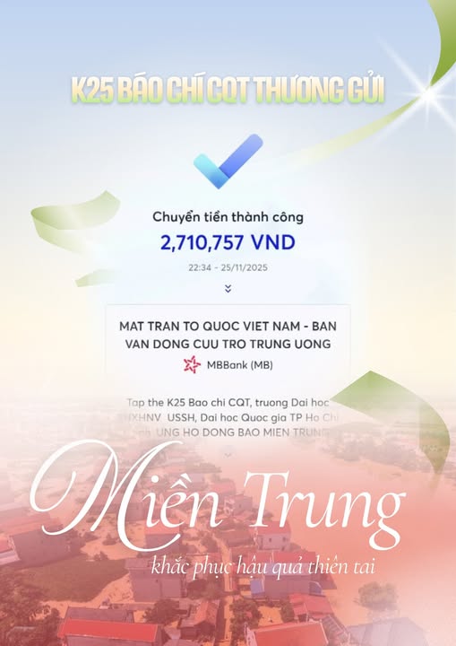 Phần quà tuy nhỏ nhưng chứa đựng nghĩa tình lớn, là lời động viên gửi đến bà con vùng lũ sớm ổn định cuộc sống. Hành động đẹp của Chi đoàn K25 Báo chí CQT thêm một lần khẳng định tinh thần trách nhiệm, lòng nhân ái và sẻ chia của tuổi trẻ Báo chí và Truyền thông.